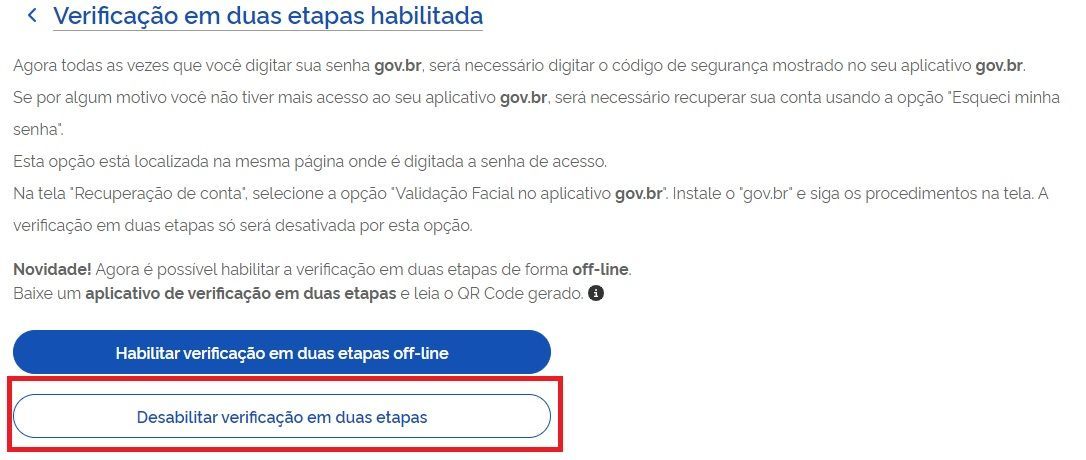 5. Cidadão deve clicar no botão Desabilitar verificação em duas etapas..